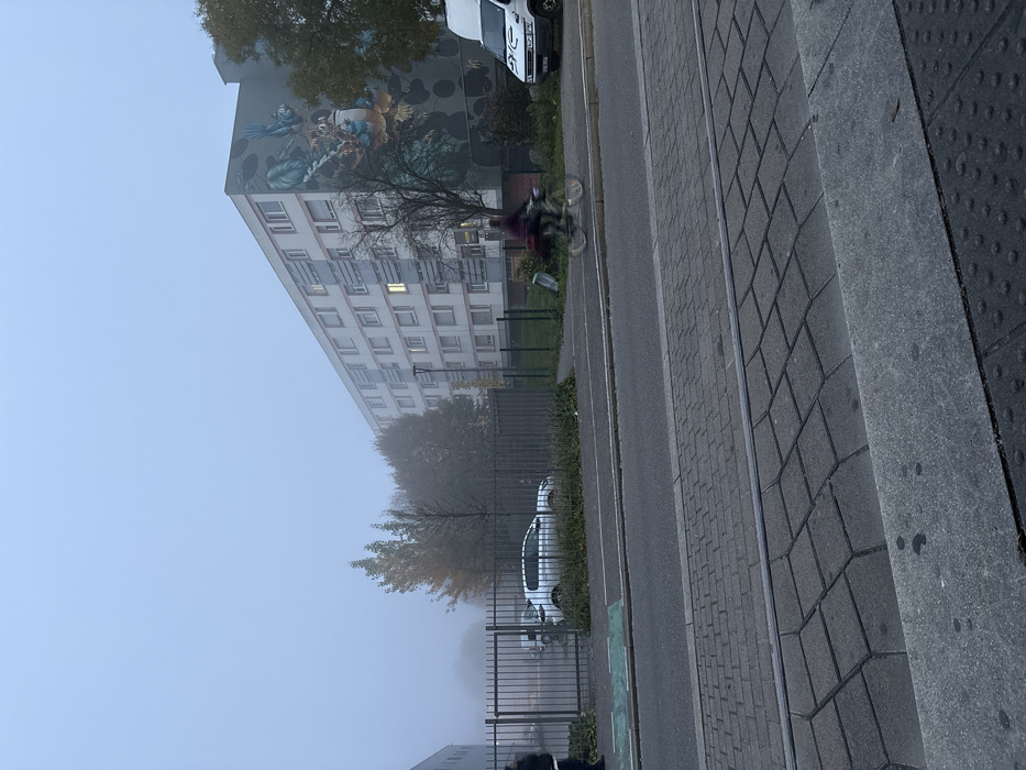 The scene depicts a foggy urban environment in Bischheim, France, observed from a low angle across a roadway. A multi-story residential building dominates the right side, featuring a large, colorful mural on its side depicting avian figures, including what appears to be a bird of prey grasping another creature, against a grey, spotted background. The building is light-colored with multiple windows, some illuminated, and grey balcony structures. In the foreground, a paved surface transitions into a grey asphalt roadway with visible tram tracks running horizontally. To the left of the roadway, a narrow sidewalk is bordered by a metal fence. Behind the fence, a white hatchback vehicle is parked on a patch of ground. Further left, a person is partially visible near the edge of the frame. Directly in front of the large residential building, a person wearing dark clothing with a reddish item over their shoulder is captured in motion blur while riding a bicycle from left to right across the frame. To the right of the bicyclist, a white commercial van with two distinct markings (possibly eyes) on its front is parked. Scattered trees, some with autumn foliage and others deciduous, are present behind the fence line and along the building's perimeter. A streetlight is visible between the fence and the main building. A green bicycle lane marking is painted on the pavement near the fence. The sky is uniformly light grey due to heavy fog, obscuring any horizon or distinct cloud formations. A dark-colored trash bin is positioned near the bicyclist, on a grassy patch between the road and the building.