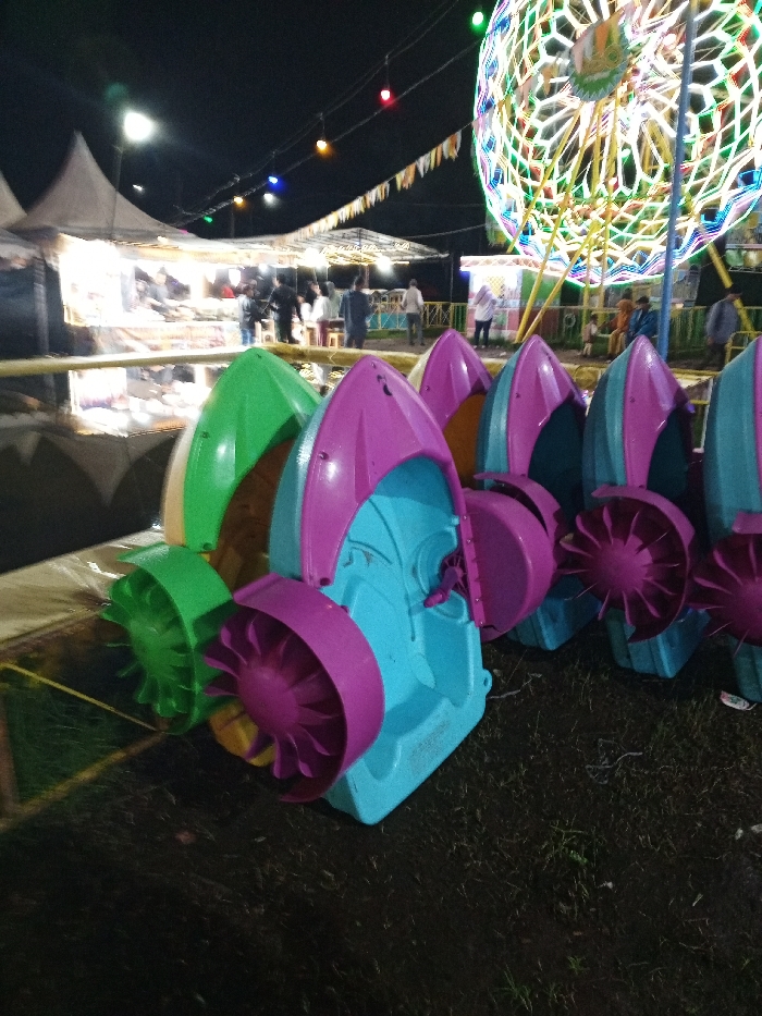 Colorful paddle boats line the edge of a grassy area at night. The boats are blue, green, and purple with matching paddle wheels. A food stand covered by white tents sits nearby, while people gather and enjoy the carnival atmosphere. String lights stretch across the space, adding to the vibrant scene. A large Ferris wheel illuminated with bright lights towers in the background.