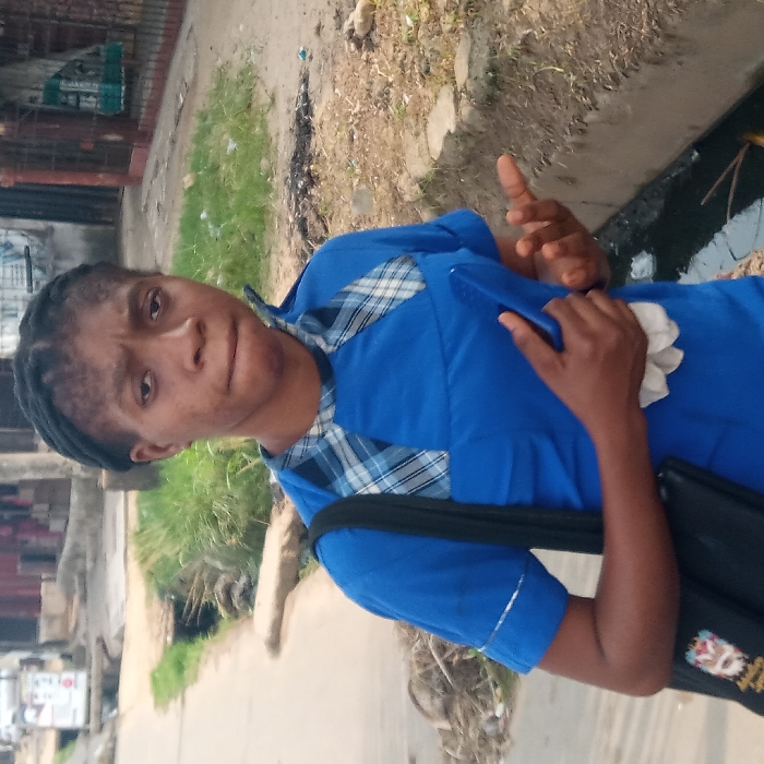 The image displays a female individual, positioned in the city of Aba, Nigeria, standing outdoors on what appears to be a street or pathway