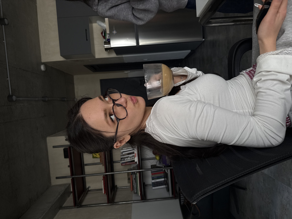 The image depicts an indoor scene within an apartment located in Yerevan, Armenia. A young female individual with dark hair and tortoiseshell-patterned round eyeglasses is seated in a black mesh-backed office chair in the foreground. She wears a long-sleeved white top with lace detailing and light-colored pants. Her head is turned to her right, with lips pursed, and she holds a clear glass bowl containing a light brown beverage in her left hand and a dark smartphone in her right hand. The environment features an exposed concrete ceiling with surface-mounted electrical conduit and light fixtures. To the left, a tall, metal-framed bookshelf filled with books is visible. To the right, a partial kitchen area is present, including dark grey upper cabinets, a stainless steel refrigerator, and a white countertop. A second individual, wearing a grey knit sweater, is partially visible on the far right side of the image. The floor is dark.