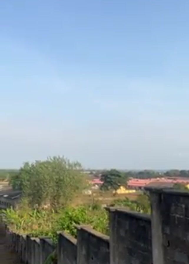 The video begins with a view from behind a dilapidated concrete block wall, revealing a landscape of greenery and buildings under a clear blue sky. As the camera moves upwards, a dirt path with wooden steps becomes visible, leading downwards through the vegetation. The foreground is characterized by lush green trees and shrubs, while in the distance, a collection of structures with red rooftops is partially obscured by the foliage. The overall setting appears to be a rural or semi-urban area with a somewhat aged or neglected aesthetic.