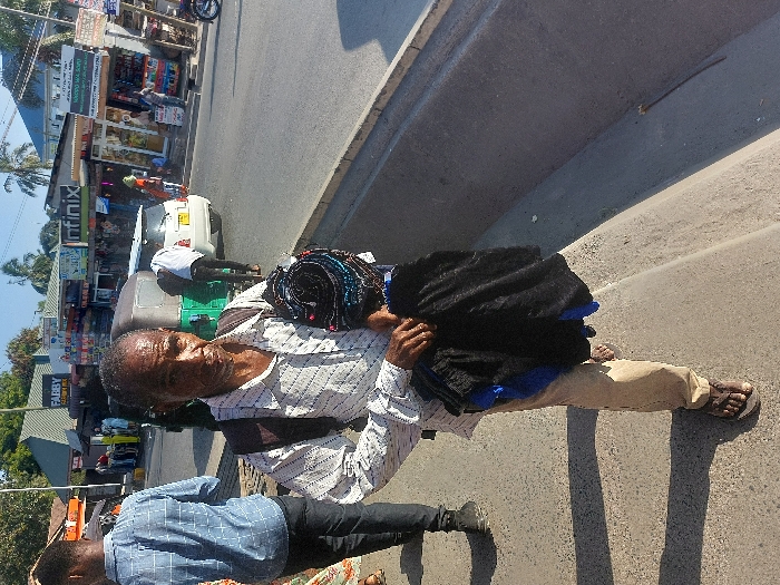 The image captures an urban commercial street scene in Dar es-Salaam, Tanzania, under bright daylight. In the foreground, an adult male with dark skin and short hair faces the viewer directly. He wears a patterned white long-sleeved shirt, tan trousers, and brown sandals, with a dark backpack visible on his shoulders. He holds a bundle of rolled, multicolored textiles in his left hand and a dark fabric garment in his right hand. To his left, partially visible, another adult male in a blue checkered shirt walks away from the camera. The street features a paved asphalt road bordered by a concrete curb, a concrete drainage channel, and a concrete sidewalk. Various commercial buildings line the street, displaying prominent signage including "FABBY" and "Infinix," along with other local signs, some in Swahili. A green and grey three-wheeled vehicle (tuk-tuk) is visible in the mid-ground, followed by a white Suzuki Swift hatchback. Numerous pedestrians are present in the background near the storefronts. Palm trees and other vegetation are scattered throughout the background, indicative of the tropical environment.