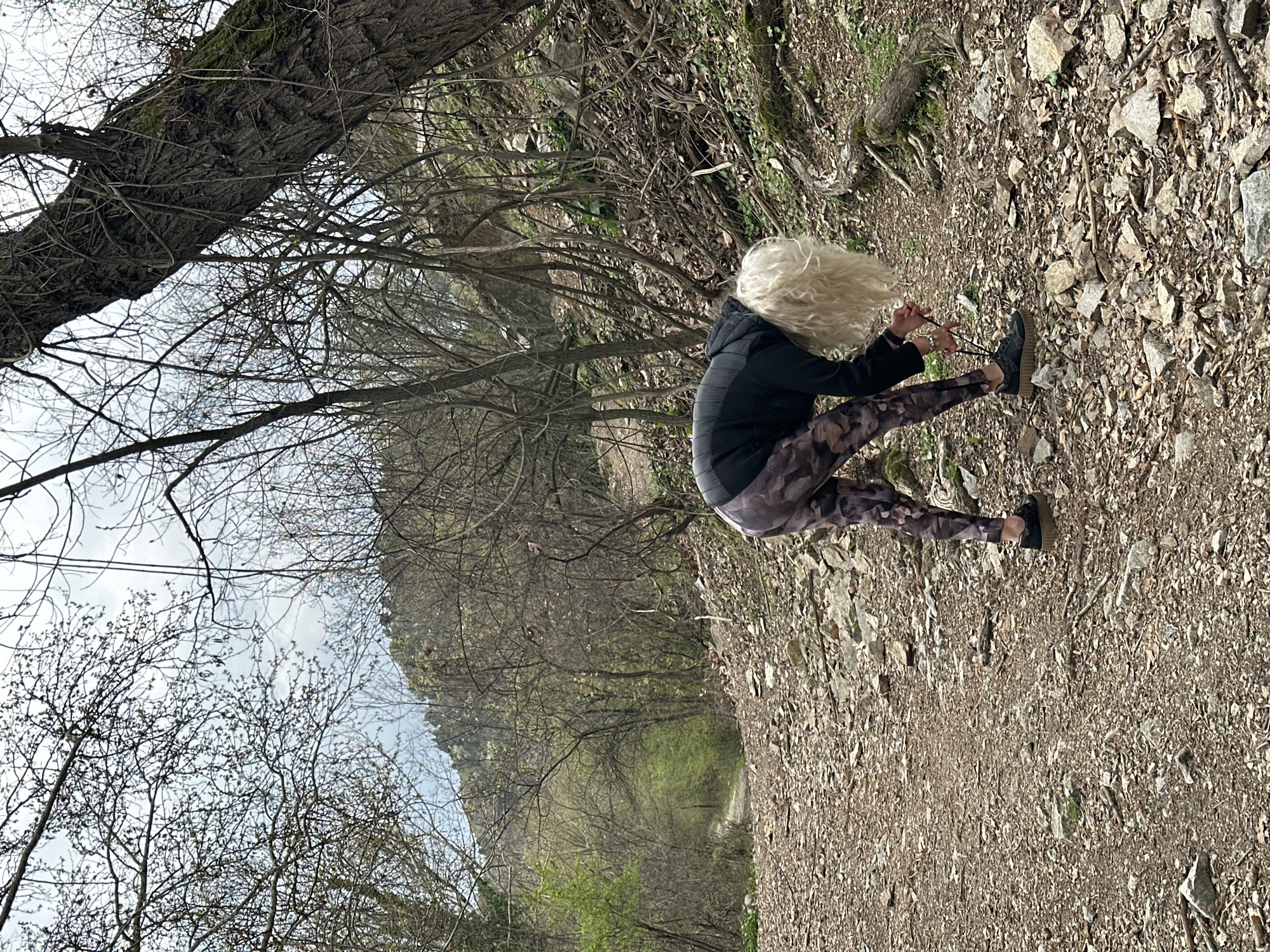 The image depicts a person with blonde, curly hair tying their shoelaces on a rocky path in a wooded area near Stara Kresna, Bulgaria. The person is wearing a black jacket and camouflage-patterned leggings. The path is covered in small rocks and debris. A large tree with bare branches is visible to the left, along with a view of the surrounding forested hills. The sky is overcast.