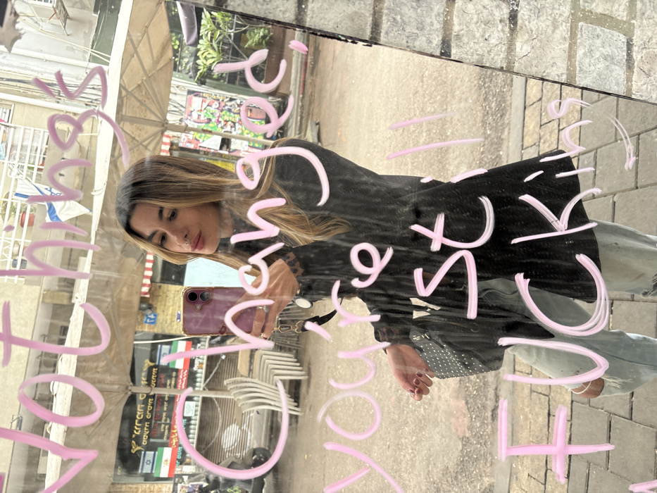 A female subject, appearing to be in an urban environment, takes a mirror selfie in Tel Aviv-Yafo, Israel