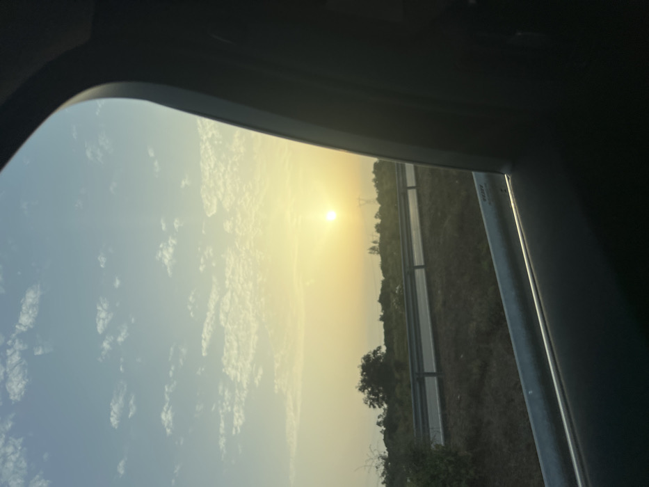 An exterior scene is depicted from the interior of a vehicle, looking out a side window during what appears to be sunrise or sunset