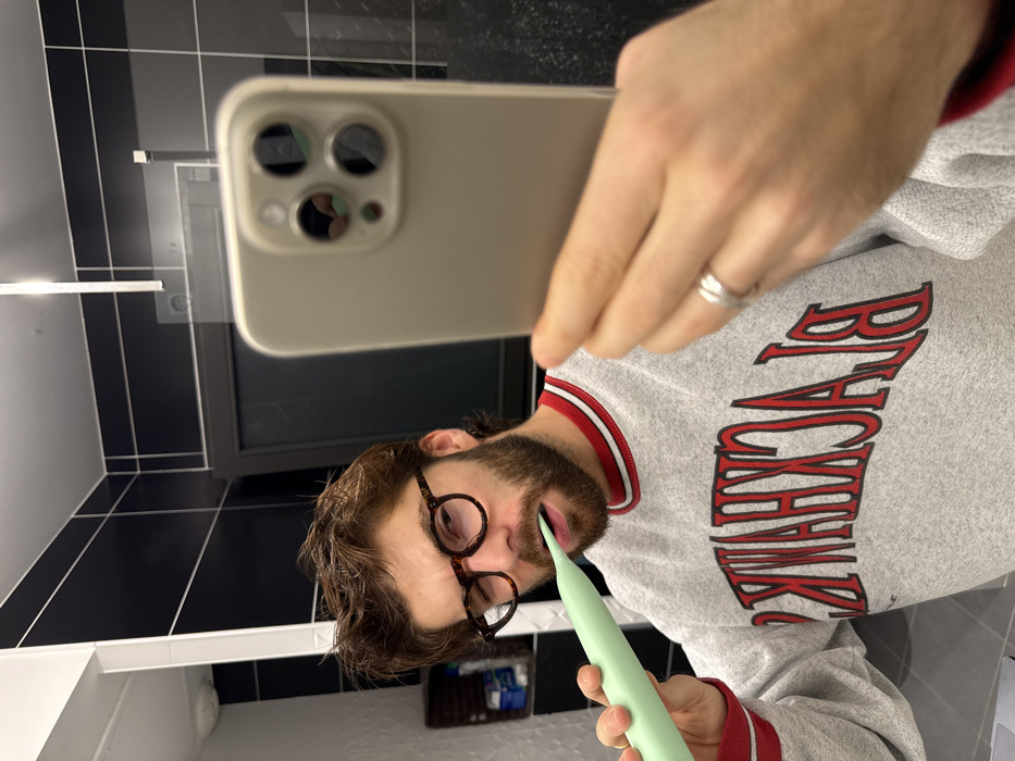 In a bathroom in Chambœuf, France, a male individual is captured in a mirror selfie while brushing his teeth. The subject has brown hair, a beard, and wears round tortoiseshell-patterned glasses. He is dressed in a light gray sweatshirt with "BLACKHAWKS" written in red lettering across the chest, featuring red and white striped trim on the collar and cuffs. He holds a light green electric toothbrush in his mouth, with his left eye slightly squinted or winking. His right hand holds a light-colored smartphone, likely an iPhone, with its triple camera lenses visible, reflecting a faint green and skin tone. A silver ring is worn on his right ring finger. The background features a tiled wall composed of dark, possibly black, rectangular tiles with white grout lines. Reflections in the mirror show a dark door frame, a vertical light fixture, and a white, circular object resembling a smoke detector on the upper left wall. Blurry objects, possibly bottles, are visible on a shelf in the far background.