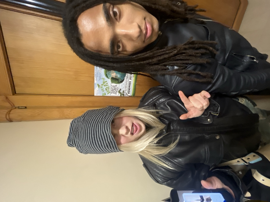 Two people pose for a selfie. A person with dreadlocks wears a black leather jacket. Another person with a striped beanie and blonde wig also wears a leather jacket and makes a hand gesture. A phone partially obscures the bottom of the frame. A light wood door and a flyer are in the background.