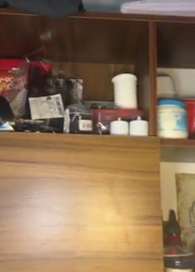 tall, wooden shelf unit with four rows of shelves. The shelves are filled with various items, including containers, jars, boxes, and packages. The items appear to be art and craft supplies. The camera pans upwards, revealing the contents of each shelf. Some items are partially obscured.