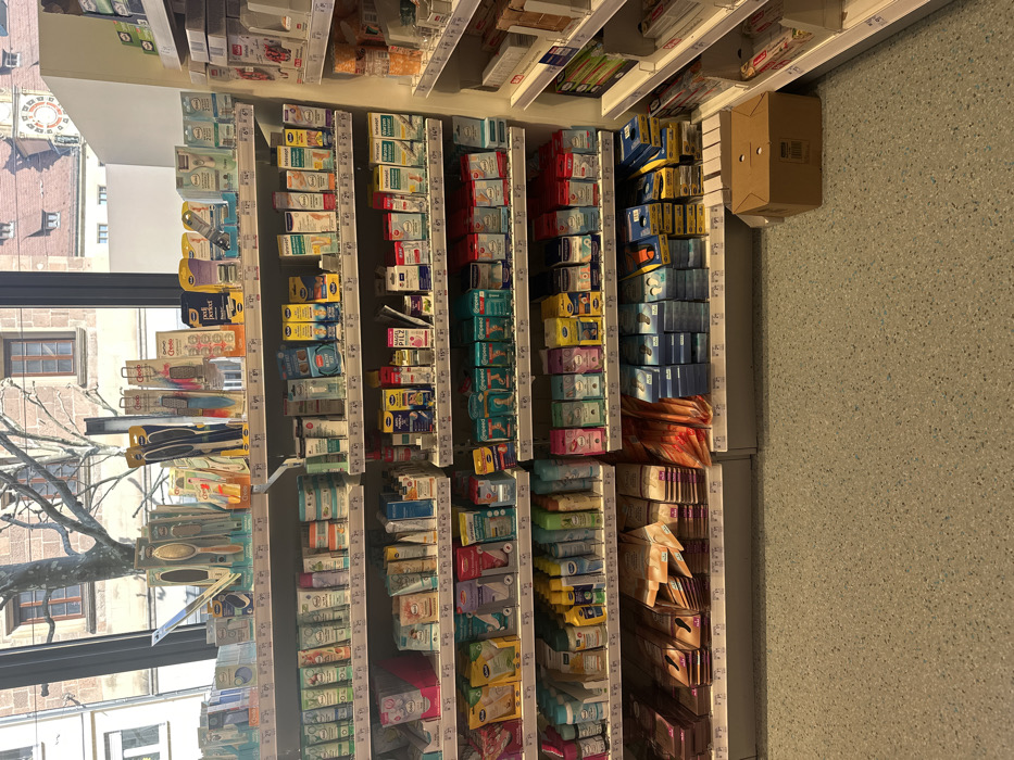 The image depicts the interior of a retail establishment located in Heilbronn, Germany, with a prominent view of the Kilianskirche clock tower through a large window. The scene is static, devoid of people. The foreground and midground are dominated by multiple white metal display shelves arranged horizontally, fully stocked with various packaged consumer products. These products predominantly include personal care items, such as foot care tools (e.g., pumice stones, foot files under the brand Credo), creams, lotions, and specialized treatments, with identifiable brands like Compeed, tetaisept, and Nagel Pilz. Price tags are visible beneath most items on the shelves. The floor is a speckled grey material. A closed brown cardboard box rests directly on the floor in the lower right quadrant. A large window occupies the upper central and left portions of the frame, providing a clear view of the urban exterior. Visible through the window are architectural details of older buildings with brown facades and multiple windows, bare tree branches, and, significantly, the distinctive red-roofed clock tower of Kilianskirche in the background, confirming the location.