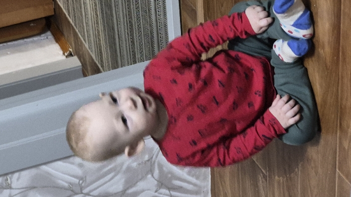 - "A young child wearing a red long-sleeved shirt with dark patterns and green pants sits on a wooden floor" by FM-xjdxm2, licensed under CC BY 4.0