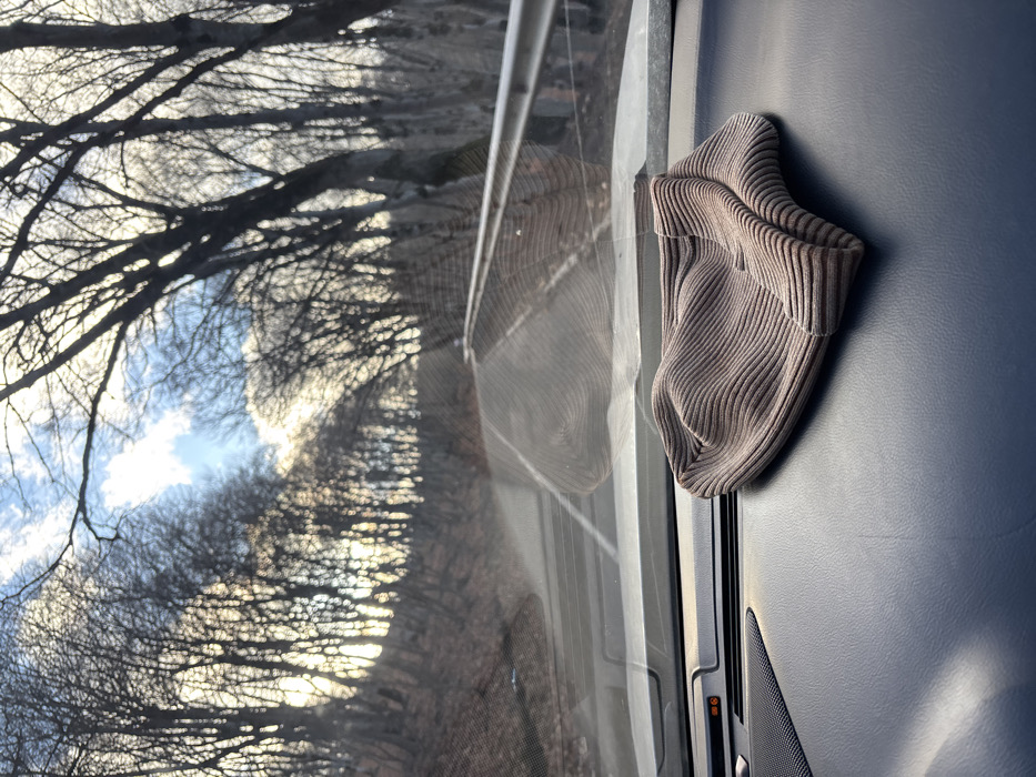 The image presents a forward-facing view from inside a vehicle on a road in Ghulelebi, Georgia. A light brown, ribbed knit beanie rests crumpled on the dark dashboard in the foreground, with a small orange indicator light visible on the dashboard's left side. Through the windshield, a paved two-lane road with a solid white right-edge line and a broken white center line curves to the left in the distance. A metal guardrail runs along the right side of the road. The road is flanked by dense stands of leafless deciduous trees, characteristic of late autumn or winter. The sky, partially obscured by the tree canopy, shows blue patches with white clouds, illuminated by sunlight from the left. No individuals are visible.