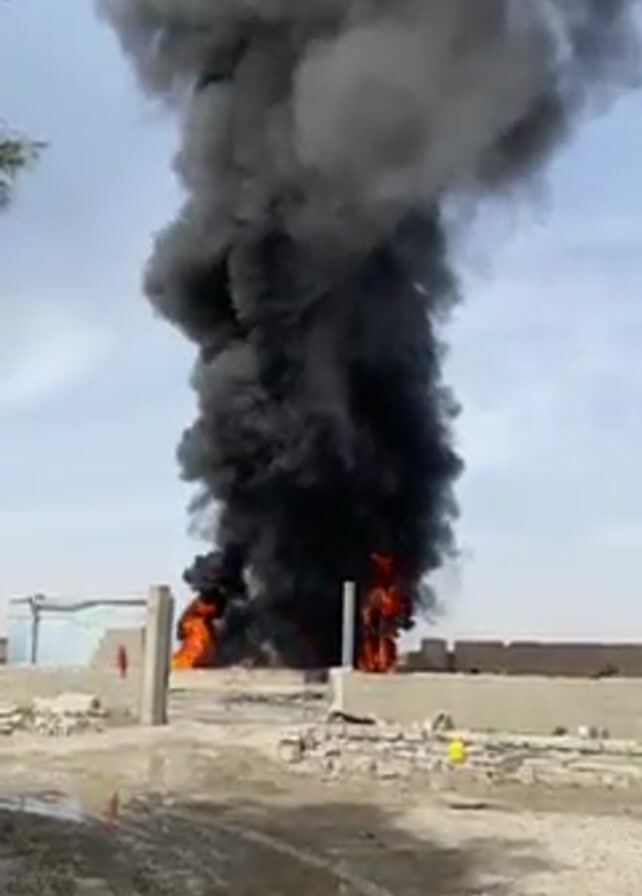 large fire with flames and a massive plume of black smoke rising into the sky. The fire appears to be located within a fenced or walled area that looks like a construction site, or perhaps a storage yard. There are low buildings visible in the background. The ground is rough and stony. No people are clearly visible in the video. There is speech audible, but unintelligible.