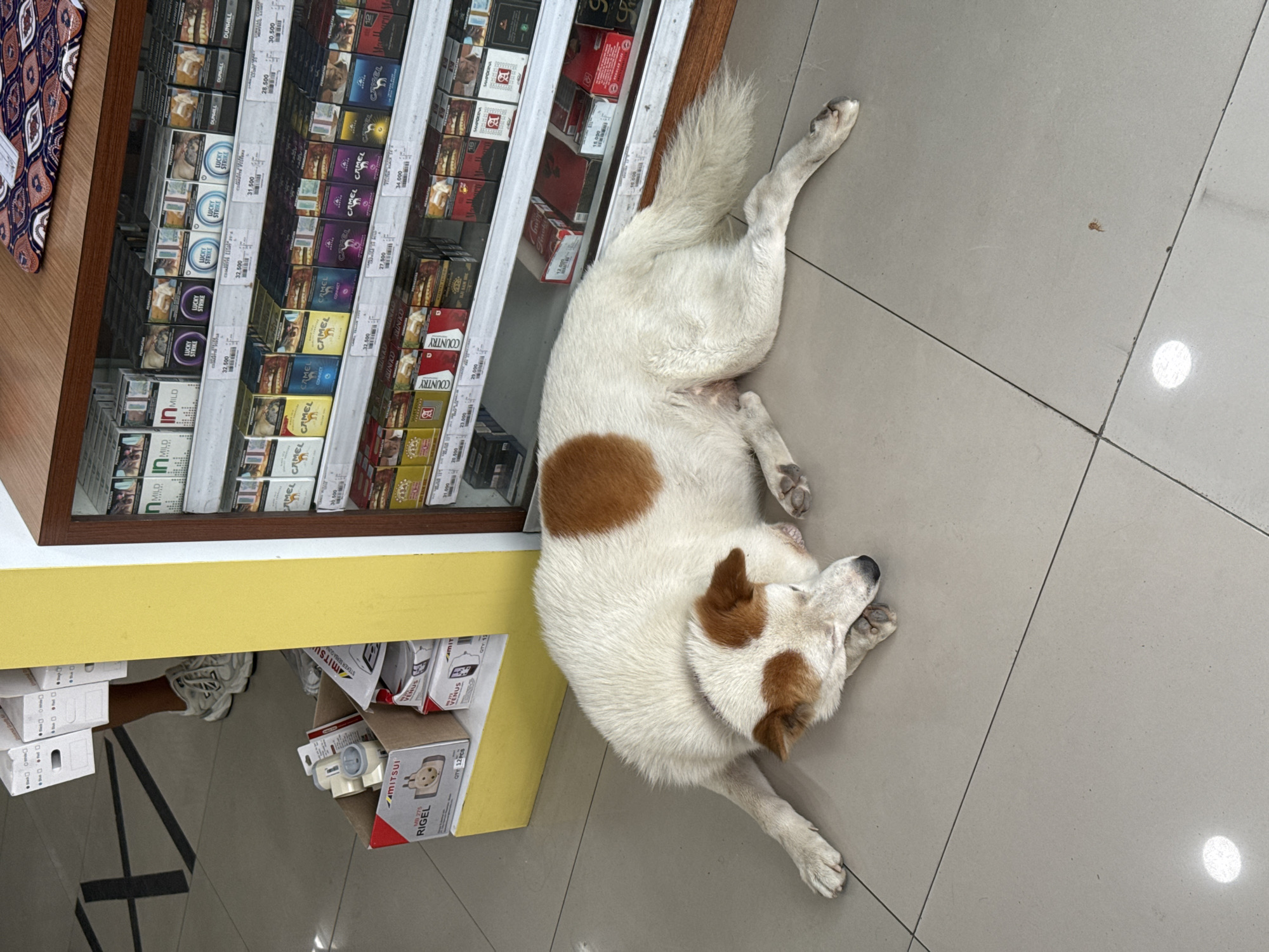 A white and brown spotted dog rests on a gray tile floor next to a display case full of cigarette packs in what appears to be a small shop