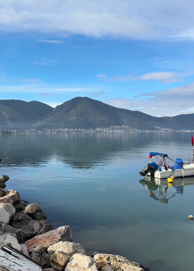 tranquil, calm scene of a lake or bay with mountains in the background under a sky with scattered clouds. In the foreground, there's a rocky shoreline. A small pier or dock is lined with several small fishing boats. Two people stand on the dock, seemingly conversing or observing the water. The water is relatively still, creating reflections of the boats and sky.