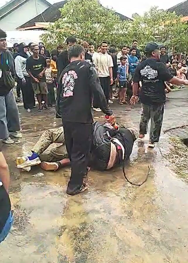 A gathering of people is taking place in an outdoor, possibly rural, setting. A group of individuals surrounds what appears to be a performance area, where someone is on the ground and others are interacting with them. The environment includes buildings, trees, and ground covered with mud or water. There is a banner visible in the background. Some individuals are wearing distinctive attire, and the overall atmosphere suggests a cultural event or performance.
