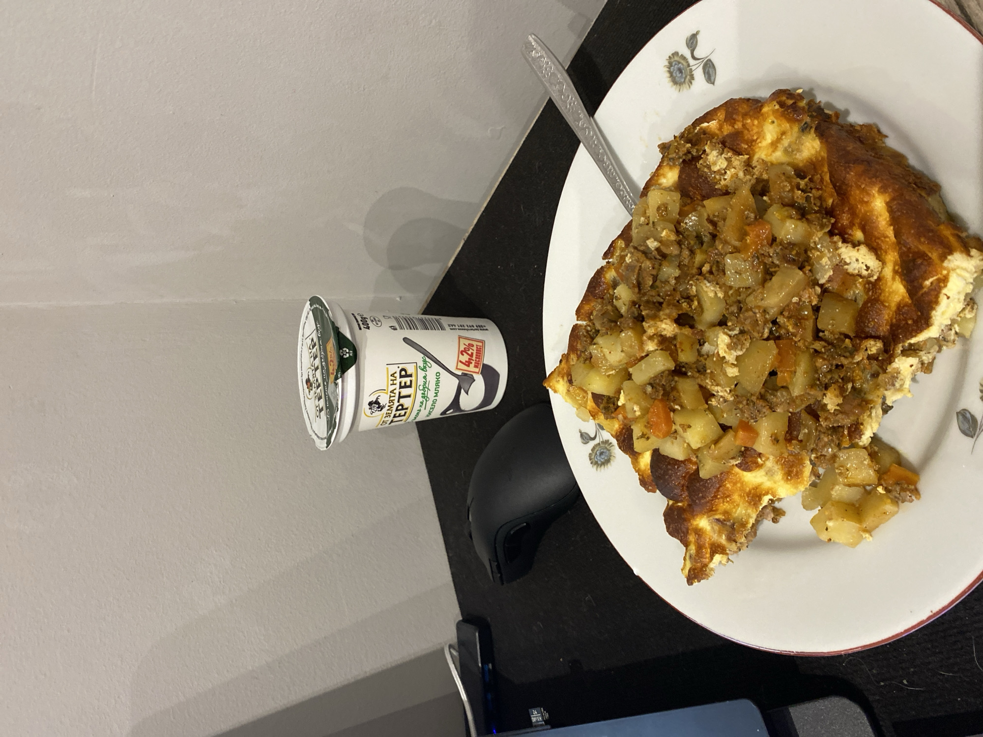 The image presents a meal consisting of an omelet topped with a mixture of potatoes, meat, and potentially other vegetables. A container of what appears to be Bulgarian yogurt sits beside the plate. The meal is set on a black surface, possibly a desk, with a computer mouse nearby. A spoon rests on the plate. The setting appears to be indoors. The branding on the yogurt container identifies it as a product made "from the land of good taste, sour milk" which is "4.2% fat." While the yogurt is clearly Bulgarian, the exact location within Varna is not indicated in the image.