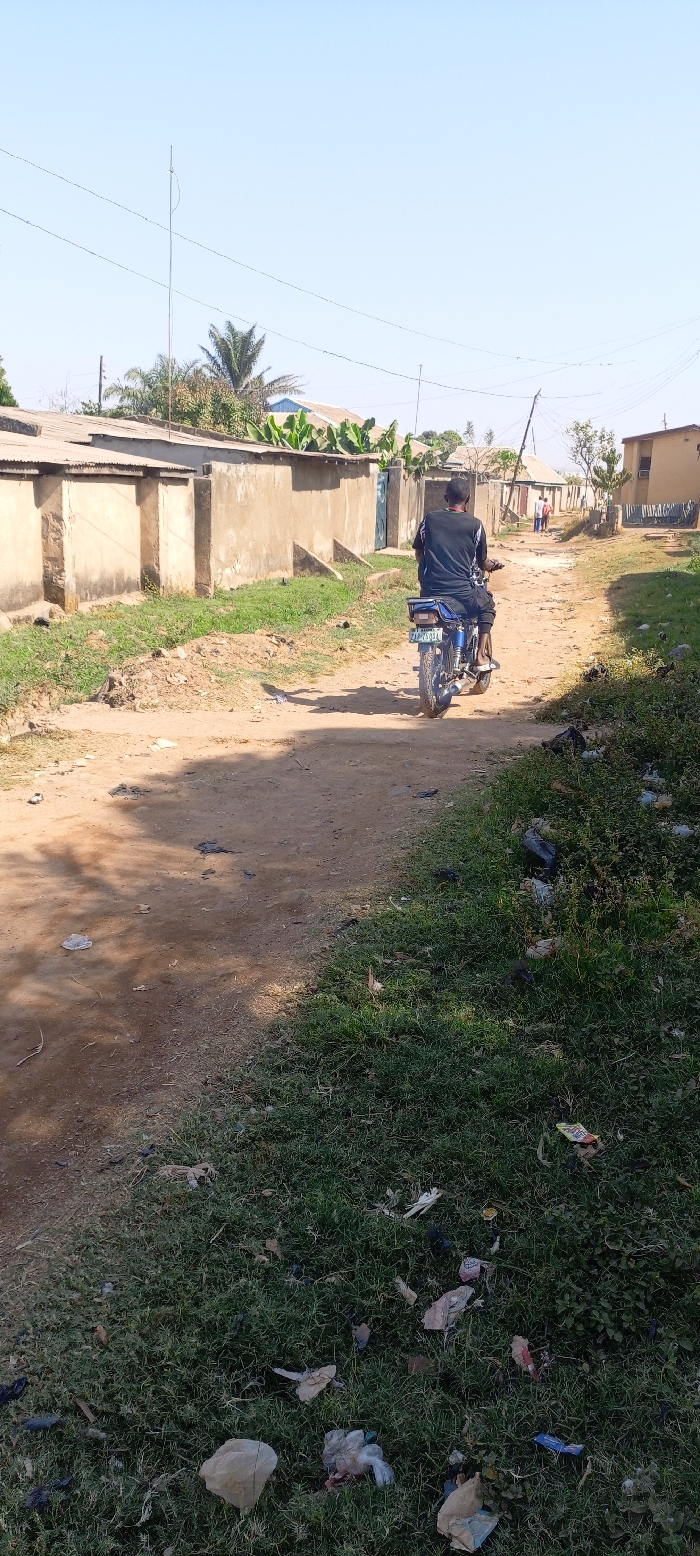 The image depicts a daytime street scene in Ungwan Liman, Nigeria. A male individual, wearing a dark t-shirt and dark trousers, is riding a blue motorcycle away from the camera on an unpaved, reddish-brown dirt road. The motorcycle bears a license plate partially visible as "KAP 758AL". To the left of the road, a long, low concrete wall, topped with corrugated metal roofing, forms a boundary for several structures. These structures appear to be single-story buildings with unpainted concrete walls and corrugated metal roofs. Green banana-like plants and other foliage are visible behind the wall and roofs. A tall palm tree is discernible further back above the structures. Overhead utility wires traverse the clear, light blue sky. To the right of the road, a strip of green grass and low-lying weeds is visible, interspersed with scattered litter including plastic bags and other refuse. In the far background, the dirt road continues, and two smaller human figures are faintly visible in the distance, appearing to walk. Additional simple residential structures are present further down the road on both sides. Shadows cast on the dirt road indicate bright daylight conditions.