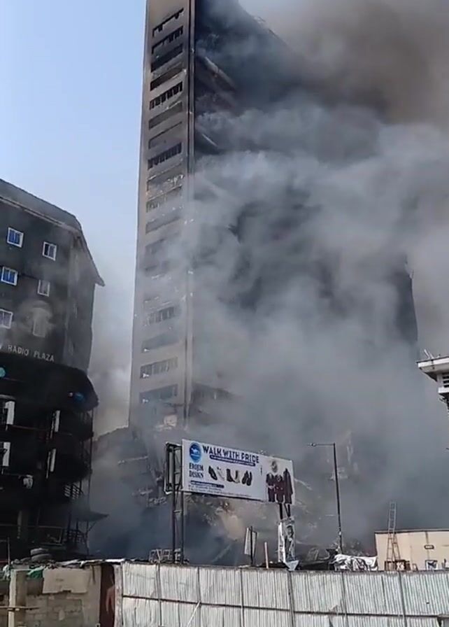 The video depicts a tall building engulfed in thick, grey smoke. The building appears to be a high-rise structure with multiple stories, and the smoke is billowing from several floors. Adjacent to the burning building is another structure, labeled "RAINBOW RADIO PLAZA", which appears to be damaged as well, possibly due to the fire. In the foreground, there's a billboard advertising "EROJIM DESIGN" with the phrase "WALK WITH PRIDE," displaying images of shoes and clothing. A corrugated metal fence is visible in front of the billboard. The ground in front of the fence is bare earth, with some debris scattered around. The sky is pale and clear.