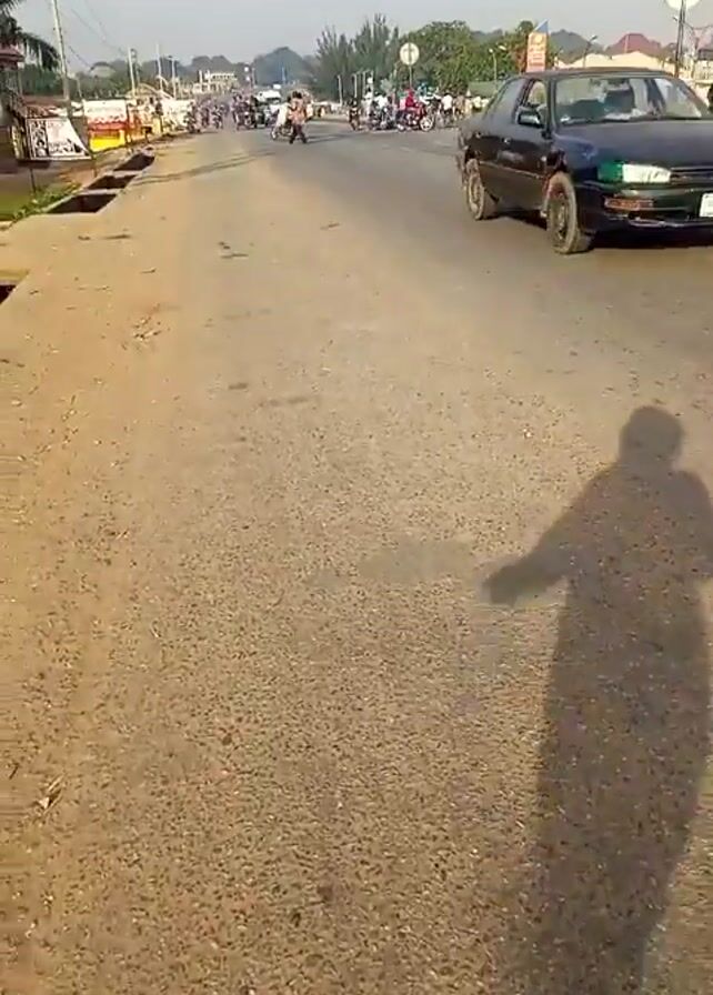 road in Nasarawa State, Nigeria, with a car driving on the right-hand side. There are motorcycles and pedestrians on the road. The road has a concrete edge and a drainage ditch. There are palm trees and small buildings along the side of the road. The sky is clear.