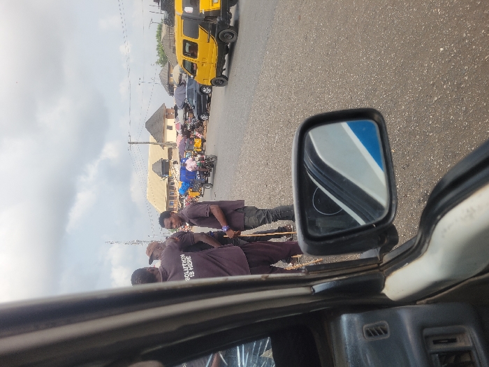 This image captures an outdoor street scene, viewed from inside a white vehicle in Unknown, Unknown. The foreground features a partial view of the vehicle's interior, including a side mirror reflecting blue, white, and black shapes. To the left, three adult males are standing on or near the paved road. One man, seen from the rear, wears a dark shirt with "SOLUTION IS HERE" printed in white on the back and holds a light-colored stick. Another man, also facing away, wears a dark shirt and a brown cap. A third man, facing the observer, wears a dark short-sleeved shirt and dark trousers, with a watch on his left wrist. The midground and background depict a busy road and market area under an overcast sky. A yellow panel van with black accents is parked on the right side of the road. Several yellow tricycle taxis (keke napep type) are visible, some parked, some in traffic. A motorcycle with a rider and a passenger, potentially carrying a blue container, is traveling towards the left. Further down the street, a dark-colored SUV or sedan is parked, and numerous market stalls with various colored umbrellas are visible. Buildings in the background are predominantly single or two-story structures with diverse roof types. Utility poles and overhead wires are present. A tall antenna-like structure is visible on the far left horizon.