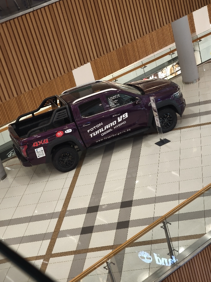 The image captures a dark purple Foton Tunland V9 Diesel Hybrid pickup truck on display within a shopping mall in Varna, Bulgaria