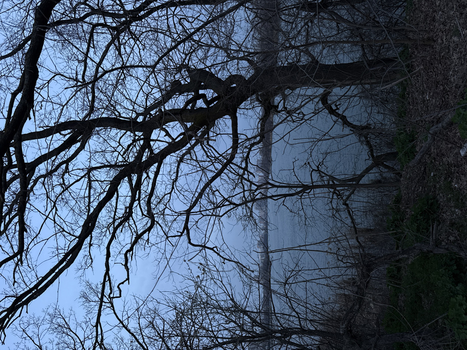 The scene depicts a body of water observed from an elevated, wooded position in the city of Unknown, Unknown. The foreground is dominated by a dense network of bare, dark tree branches and trunks, indicating a dormant season. The ground immediately below these trees shows dark, low-lying vegetation and scattered leaf litter. A wide, still body of water, appearing grey-blue, occupies the midground. On the distant horizon, a cityscape is visible, characterized by several indistinct high-rise buildings. The sky is a pale blue-grey, consistent with twilight conditions or an overcast day. No individuals, animals, or specific activities are present within the frame.