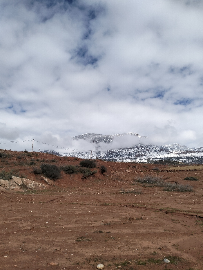 The image depicts a vast outdoor landscape in Ouaouizert, Morocco, under an overcast sky with patches of blue. The foreground and midground consist of reddish-brown, dry earth, exhibiting slight undulations and faint track marks, suggesting erosion or infrequent passage. Sparse, low-lying green and grey-green scrub vegetation is scattered across this terrain, particularly concentrated in small clusters on elevated sections. Several light-colored rocks are visible on the ground surface. In the mid-ground, extending from the left, a series of wooden utility poles with multiple overhead wires runs horizontally. Behind these poles and vegetation, a dark, undulating line suggests a fence or boundary along the base of the distant features. The background is dominated by a snow-capped mountain range, with significant white snow cover contrasting against darker rock faces. Portions of the mountain peaks are partially obscured by low-hanging clouds or mist, which blend with the overcast sky. No people, animals, or active interactions are visible.