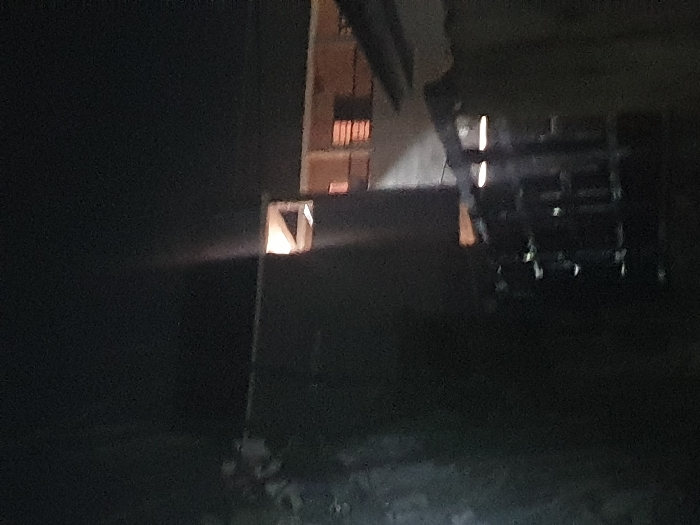 A dimly lit outdoor space at night reveals a spotlight or lantern on a pole, casting a beam of light. In the background, a building-like structure is visible, with some lit windows. An unclear, possibly mechanical, object is situated near the building. The overall darkness obscures finer details.