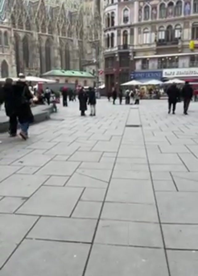 street scene in front of a tall cathedral. The cathedral is grey and stone, with a tall, ornate spire. The roof is tiled with a geometric pattern. In the foreground is a square paved with large grey tiles. A number of people are walking around the square, most wearing dark coats. There are also several shops and cafes visible, with signs in German and English. The sky is overcast. The camera pans up to show the full height of the cathedral. A person can be heard speaking in the background.
