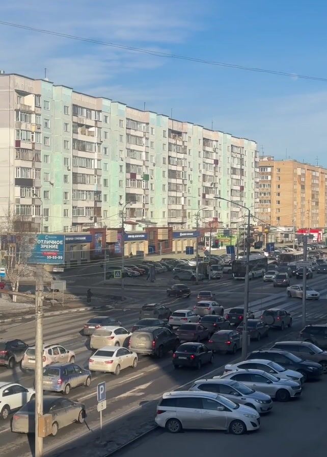 The video presents a high-angle view of a bustling city intersection under a clear blue sky with sparse clouds. In the foreground, numerous cars are parked in rows. The intersection is congested with moving vehicular traffic, including cars and a bus. Pedestrians can be seen using the crosswalks. The backdrop features a long stretch of multi-story apartment buildings, painted in light blue and beige colors. A billboard is also visible. The overall scene depicts a typical urban environment with heavy traffic flow.