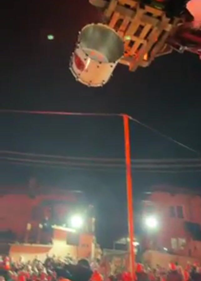 At night, a large crowd gathers in a town. A wooden structure with a drum attached to it is being lifted by a crane. The crowd is illuminated by streetlights, and some are wearing orange vests. A fire truck can be seen in the background.