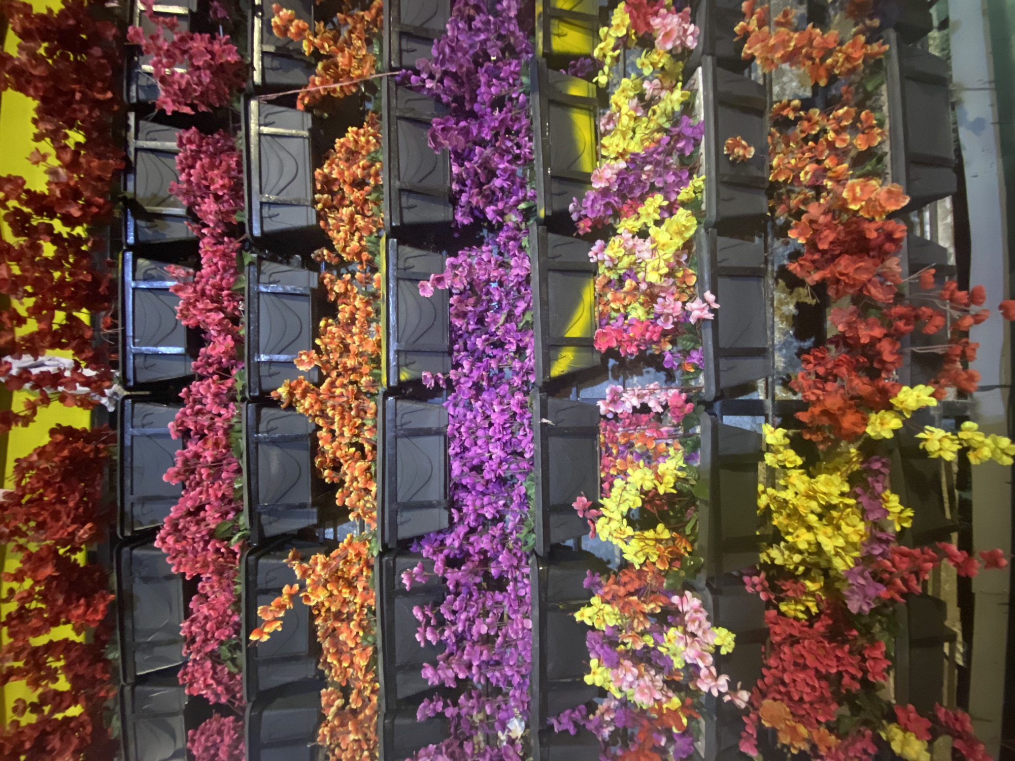 vertical garden with several rows of black containers filled with colorful artificial flowers