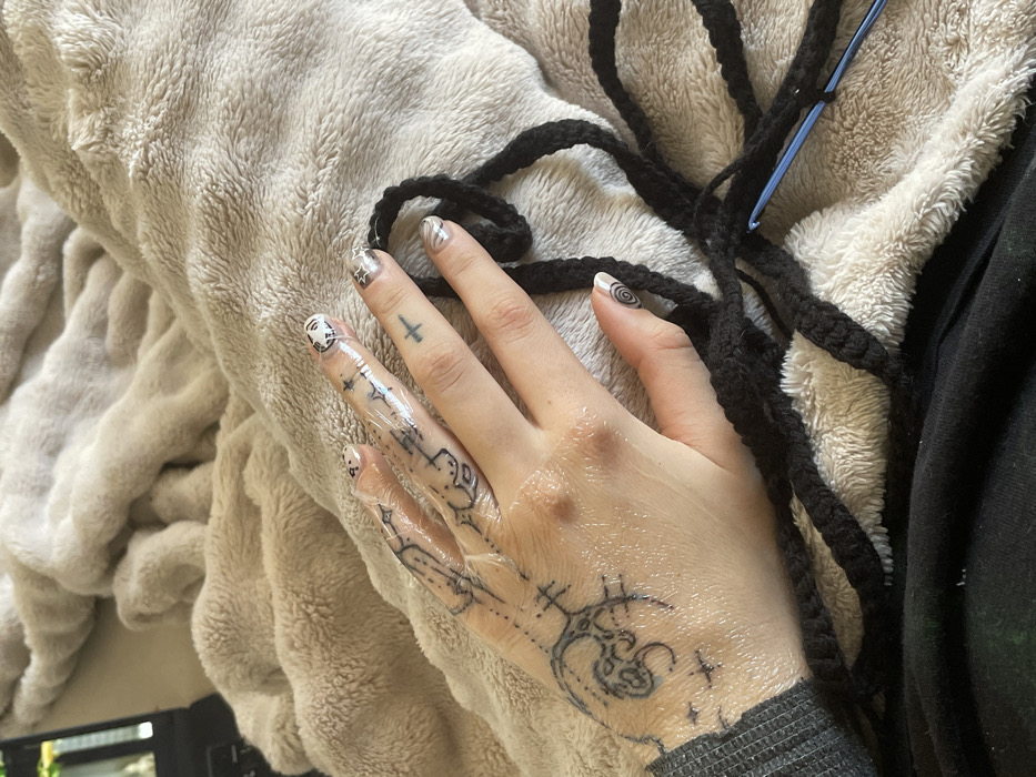 The image presents a close-up, high-angle view of a person's right hand engaged in a crafting activity within an indoor environment. The hand, exhibiting fair skin, displays numerous black ink tattoos: geometric patterns and linear designs on the fingers, and more complex symbols, including a stylized om-like glyph and crosses, on the back of the hand. A small cross tattoo is visible on the middle finger. The thumb, index, middle, and ring fingers are partially encased in a clear, glossy, thin protective film or bandage. The fingernails are adorned with distinct polish designs, featuring black and white swirls on the index and ring fingers, a white spiral on the pinky nail, and a celestial body motif on the thumb nail. The hand rests upon a light beige, highly textured faux fur or fleece blanket. It is shown manipulating a length of black, braided or crocheted material, approximately 1-2 cm in width. A blue-handled crochet hook is visible, inserted into the black material, consistent with the act of crocheting. In the lower left quadrant, a section of dark-colored clothing is visible beneath the blanket. A minimal, out-of-focus portion of an electronic screen, likely belonging to a laptop, is discernible in the upper left background. The scene is confined to an indoor setting. No discernible visual elements within the image provide specific markers or contextual information to determine its precise location within the city of Budva, Montenegro.