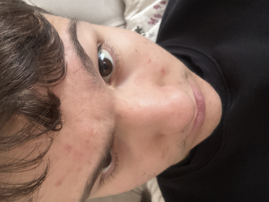 This image depicts a young individual indoors in Kozloduy, Bulgaria. The precise location within the city is unidentifiable from the visual evidence, but the scene is consistent with a domestic interior. The subject, appearing to be a male teenager or young adult, is captured in a high-angle, close-up shot, looking directly upwards at the camera. The individual has dark brown, wavy hair that partially covers the forehead. The skin is light-toned, with multiple red lesions consistent with acne visible on the forehead, nasal bridge, and cheeks. Faint stubble is present on the upper lip and chin. The eyes are dark brown, and the eyebrows are dark and well-defined. The nose is prominent. The lips are pale pink and slightly parted. The subject is wearing a black crewneck garment. The background is blurred, showing light-colored fabrics, specifically a patterned textile on the right, possibly bedding, and a lighter, potentially striped textile on the left, indicating a bedroom or similar personal space.