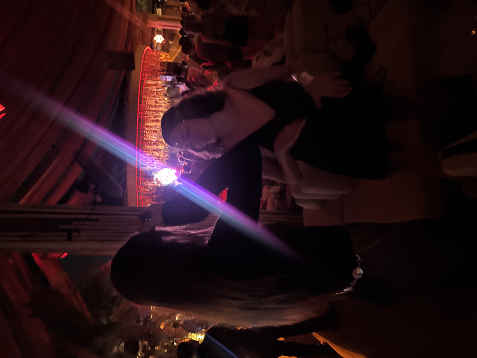 A dimly lit, rotated image shows two figures against a backdrop of what appears to be a bar or event space