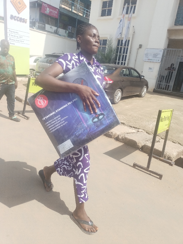 - "An outdoor daytime image captured on a street in Unguwar Kaya, Nigeria, shows a woman walking from left to right while carrying a boxed standing fan" by FM-qd9ou1, licensed under CC BY 4.0