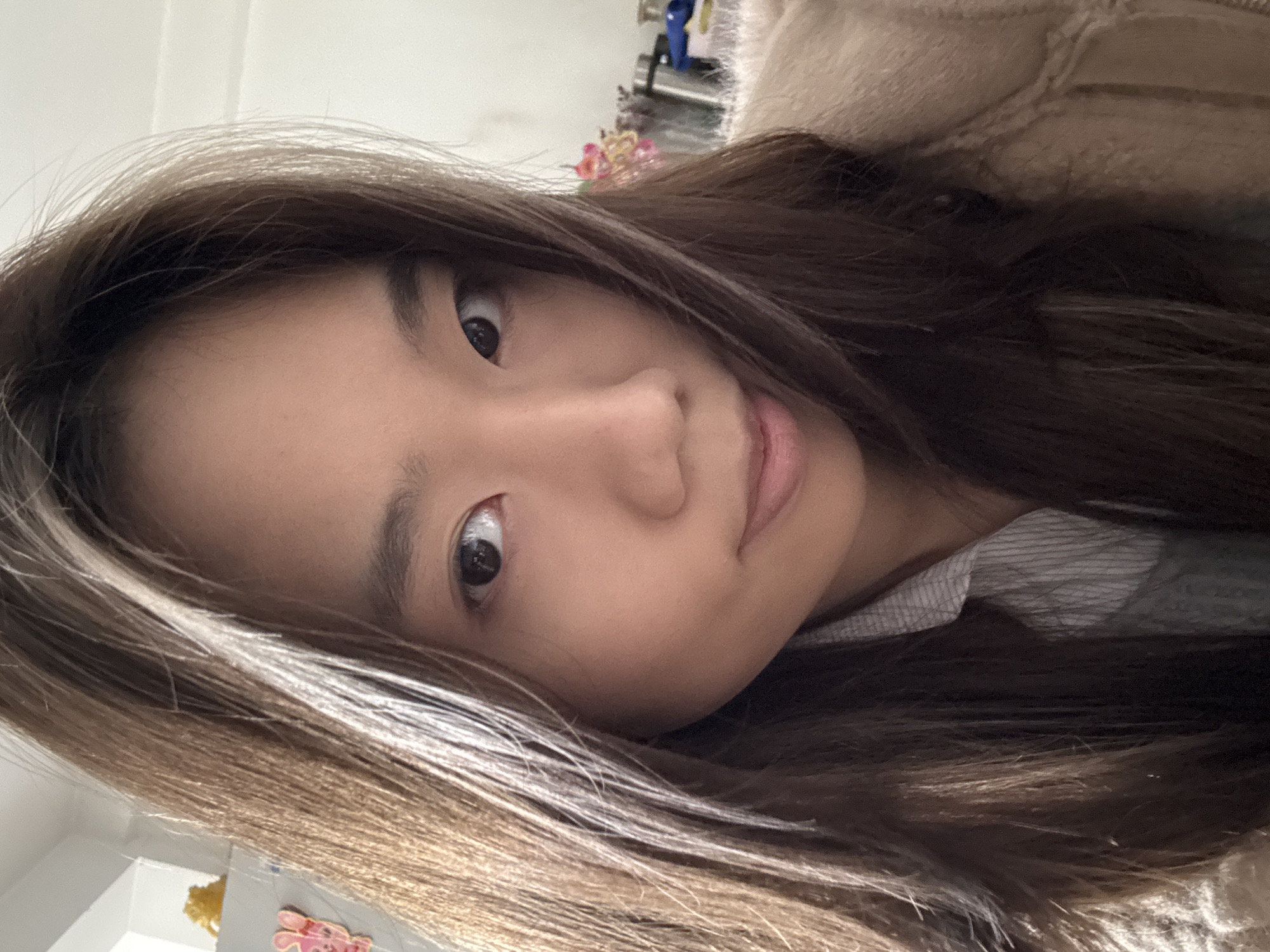 A close-up selfie of a young woman with long, brown hair and fair skin. She is facing the camera with a slight tilt of her head. Her eyes are open and looking at the camera. She is wearing a light-colored, collared shirt and a beige jacket. The background is blurred, but it appears to be an indoor setting. I cannot determine the location is Shapingba District, China from the image.