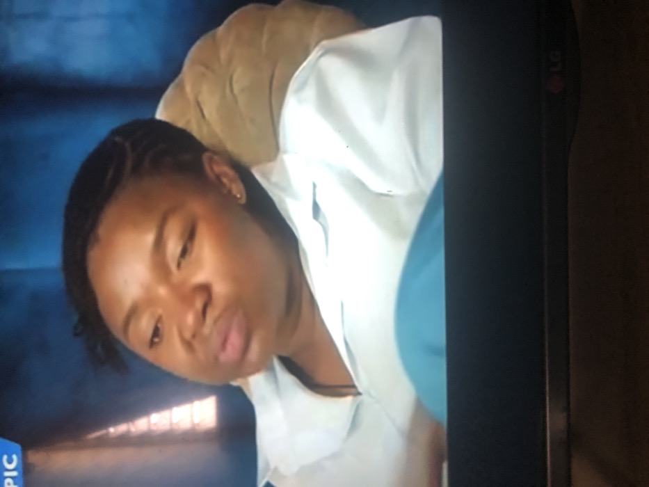 An adult female, characterized by a dark skin tone and short, dark braided hair, is depicted from the chest up in an indoor setting within the city of Masaka, Nigeria. She wears a light-colored, collared shirt, unbuttoned at the top, over a dark garment, with teal or light blue fabric visible below the shirt. A small, light-colored stud earring is present in her right earlobe. She is seated or reclining, resting her head against a light brown, padded object that serves as a headrest. Her head is tilted slightly down and to the left, with her eyes partially closed or looking downwards, and her lips are slightly pursed. The background is a dark blue wall or curtain, with a blurry, vertical lighter element visible on the left. The image itself is a screen capture, indicated by a partially visible "LG" logo on the bottom right bezel and a "PIC" logo in the upper left corner.