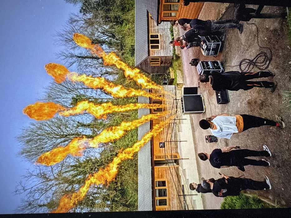 An outdoor scene in Epping Forest, United Kingdom, depicts a pyrotechnic display against a backdrop of wooden buildings and bare trees under a clear blue sky. Seven prominent, vertical plumes of bright orange flame emanate from ground-level emitters positioned in front of a single-story wooden building. This building features light-colored window frames, a dark roof, and a prominent ramp and steps leading to an open doorway. A small sign partially visible near the door appears to read "Fire". In the foreground, a group of approximately ten adult males observes and operates equipment on a paved ground surface. On the right, several individuals are clustered around professional road cases containing electronic equipment, with cables sprawled on the ground. One individual in black workwear faces away from the camera, interacting with these controls. To the left of this cluster, another individual in a white hooded sweatshirt and orange t-shirt holds a smartphone, apparently recording the scene. Two large, black, rectangular units with light-colored edging, resembling speakers or monitors, are positioned centrally near the flame emitters. Additional individuals are scattered across the foreground and midground, observing the display. The surrounding area includes patches of grass and low vegetation, with deciduous trees in the background appearing largely bare of leaves.