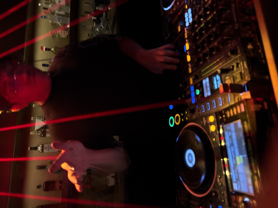 The image depicts a male disc jockey (DJ) operating professional audio equipment within a dimly lit bar or nightclub