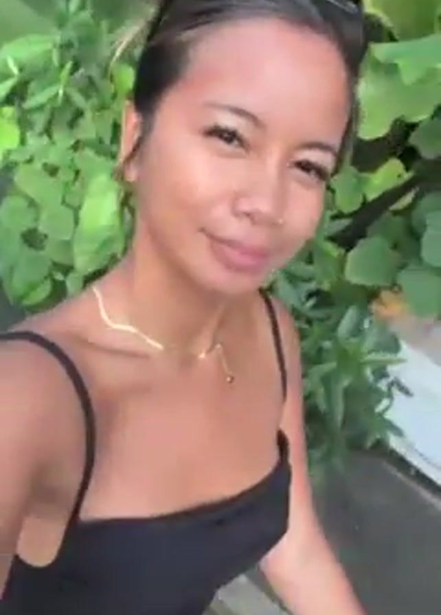 A woman films herself while walking outside, holding hands with someone who is wearing sandals. The woman is wearing a black tank top and shorts. She has a gold necklace on. Her hair is pulled back. She looks directly at the camera. In the background are plants and a building. Later in the video, she opens her mouth wide and briefly yells.