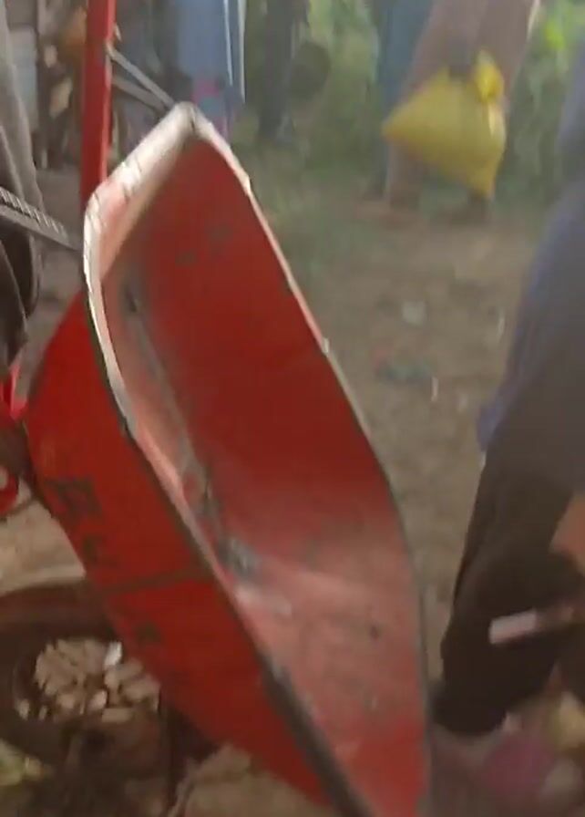 bustling outdoor market scene. Several people are visible, some dressed in traditional Muslim attire, while others are wearing casual clothing. A man wearing a hat and a tan jacket is seated on a blue motorcycle, which is laden with green leafy vegetables. Other individuals are seen carrying bags and pushing wheelbarrows, suggesting they are either vendors or customers. The background shows simple buildings, some constructed with mud bricks, contributing to the rustic atmosphere of the market. The overall impression is that of a lively marketplace where people are engaged in buying and selling goods, possibly agricultural produce.