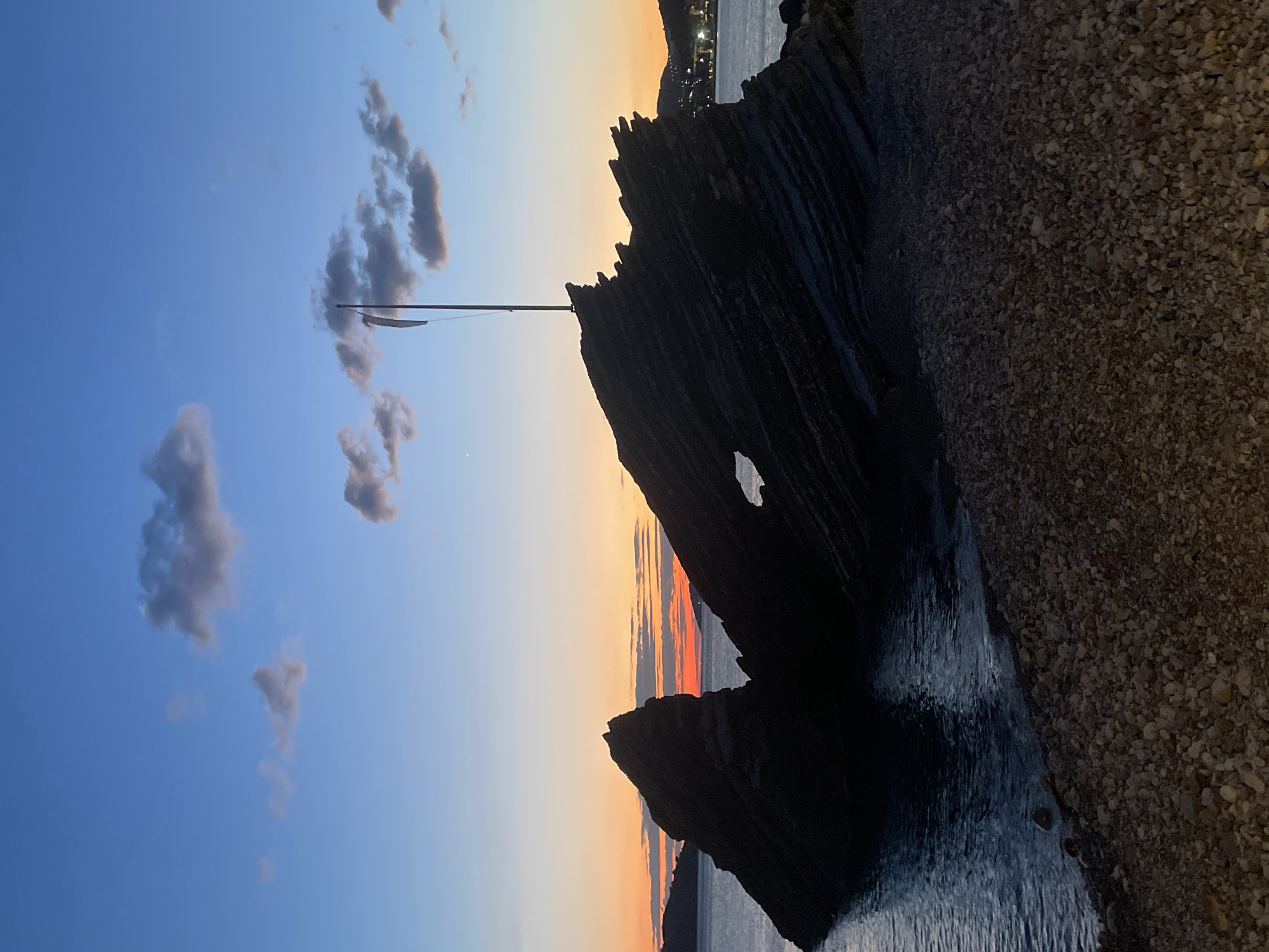 The image depicts a coastal scene at dusk in Boreti, Montenegro. The sky transitions from a deep blue overhead to vibrant orange and red hues at the western horizon, indicative of sunset. Scattered dark grey cumulus clouds are present in the blue portion of the sky. In the foreground, two prominent dark rock formations are silhouetted against the setting sun. The larger formation, positioned right of center, exhibits distinct horizontal geological layering and features a natural, irregular aperture near its base on the left side. A tall, slender pole, bearing a white, elongated fabric object resembling a banner or windsock, extends vertically from the apex of this larger rock. To the left, a smaller, pointed rock formation rises directly from the water. The immediate foreground comprises a dark pebble beach, which transitions into calm, dark blue sea water. In the distant background to the right, a stretch of illuminated buildings or streetlights is visible along a coastline, while a faint, low-lying landmass is discernible on the left horizon. No human figures or active elements are present.