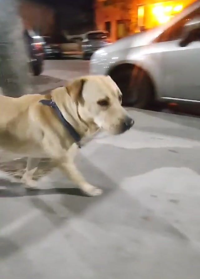 A tan Labrador dog wearing a blue collar is walking down a sidewalk at night