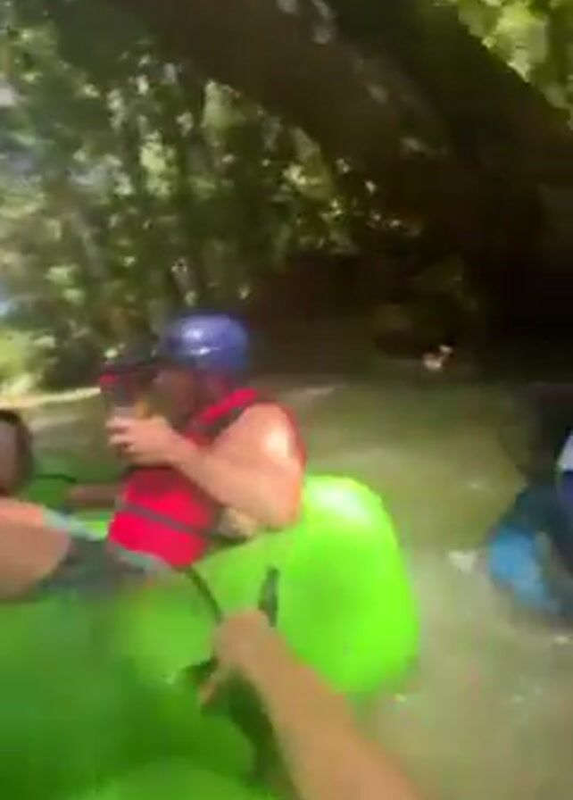 three people in inner tubes floating down a river in a lush, green environment. They are all wearing life jackets and helmets. The person filming is in a bright green inner tube and is mostly out of focus. The other two people, one in a green inner tube and the other in a blue one, are more visible. The person in the blue inner tube is face down in the water at one point, but then they sit up. The river is surrounded by trees, creating a dense forest canopy overhead. The sunlight filters through the leaves, creating dappled light on the water. The overall atmosphere is one of relaxation and enjoyment.