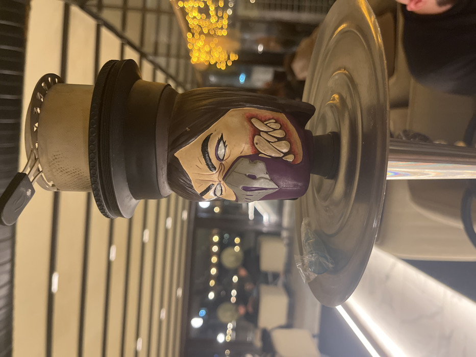 The image presents a close-up view of a custom hookah pipe situated within an indoor lounge or cafe environment in Stara Zagora, Bulgaria. The central subject is the hookah's stem and upper components. The stem features a custom head shaped as the character Mileena from Mortal Kombat, depicted with dark hair, pale skin, furrowed brow, white eyes with purple pupils, a gray-purple facial mask, and exposed monstrous teeth on its left side, rendered in off-white with reddish gums. Above this head, a black collar-like component is visible, topped by a light beige phunnel-style hookah bowl. A metallic heat management device, resembling a Kaloud Lotus, rests on the bowl, containing a small dark object, likely a charcoal piece. Below the character head, a circular, metallic ash tray with concentric ridges holds a small, clear plastic packet containing a light blue single-use hookah mouthpiece tip. The hookah's main stem is metallic and reflective. The background is intentionally blurred, indicating an evening or nighttime setting with ambient warm lighting. Linear light fixtures are visible on the ceiling. Through a large window or partition, exterior or distant interior bokeh lights are present. In the mid-ground, several indistinct human figures are seated on light-colored (beige/cream) chairs or couches, suggesting other patrons. Decorative yellow string lights are visible on the right side of the background. A partial view of a person's shoulder and arm, wearing a dark garment, occupies the lower right foreground. The hookah is assembled and appears ready for use.