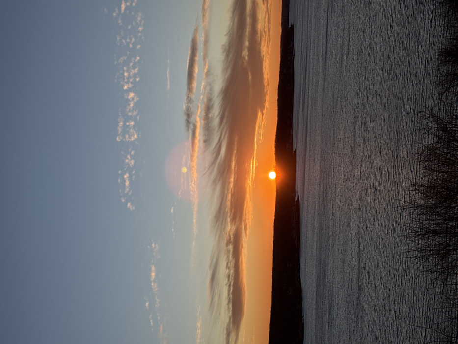 A tranquil sunset scene over water. The sun, a bright orange orb, dips below the horizon, casting a warm glow. Wispy clouds stretch across a gradient sky, from blue to orange. A dark shoreline separates the sky from the shimmering water. Sparse vegetation dots the right edge of the frame. The image is rotated 90 degrees counter-clockwise.