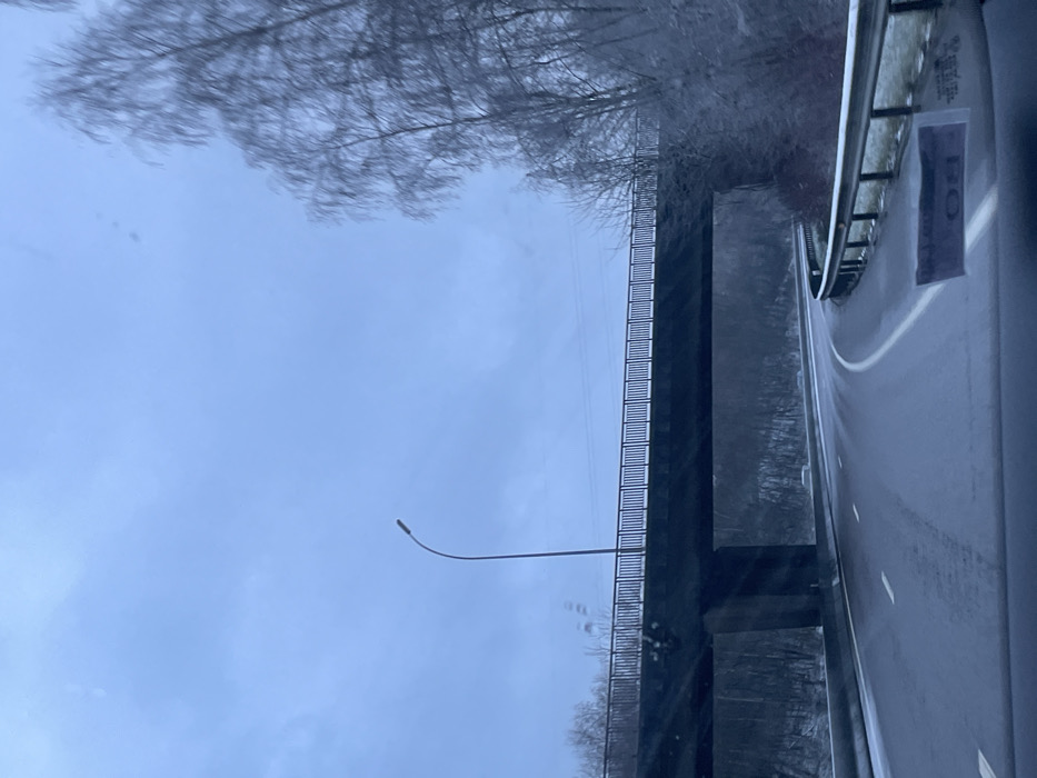 The image captures a view from inside a vehicle on a wet road. A bridge spans overhead, constructed of dark stone or concrete, and features a pedestrian walkway along one side. A streetlight extends outward from the bridge. Bare trees are visible on either side of the bridge. The sky is overcast, giving the scene a muted, gray tone. A vehicle window is visible on the right.