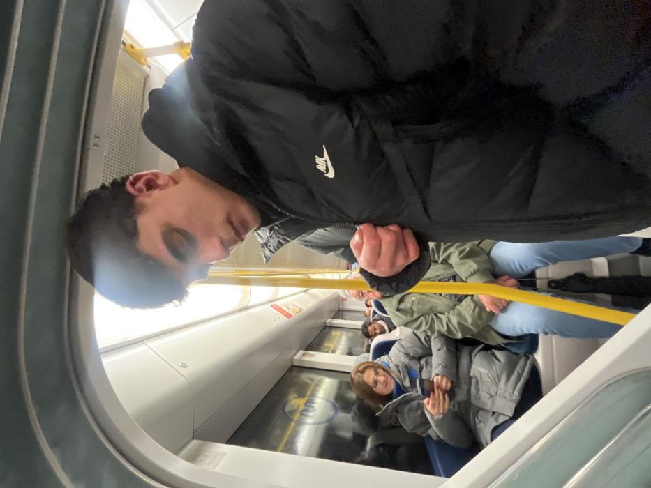 man wearing a black Nike puffer jacket. He is standing on a train car, possibly on the London Underground, with other seated passengers behind him. The train car is white with a grey floor. Some passengers are wearing jackets, and a yellow handrail is visible. The perspective is unique, potentially taken from a low angle.