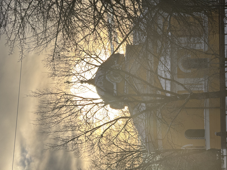 The image depicts the Resurrection Cathedral (Voskresenskiy sobor) in Kronstadt, Russia, situated in a winter setting. The cathedral is a yellow-painted Orthodox church with white architectural trim, featuring arched windows and a dark dome topped by a cross. It is partially obscured by a dense arrangement of bare, deciduous tree branches, some lightly dusted with snow. A strong, hazy light source, likely the sun, is positioned behind the cathedral's dome, casting a bright yellow and orange glow across the sky, which transitions to gray clouds above. The ground in the foreground and around the cathedral appears covered in snow. A single power line is visible stretched horizontally across the upper-left portion of the sky. In the lower-left foreground, a lone individual, dressed in dark clothing with a light-colored head covering, is walking from left to right on a snow-covered path or sidewalk.